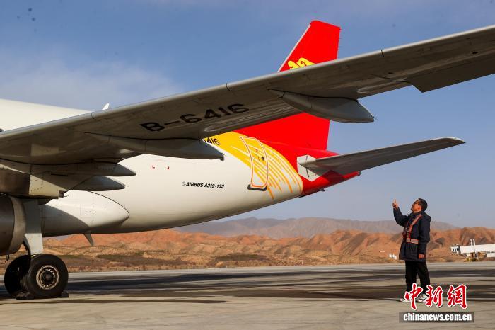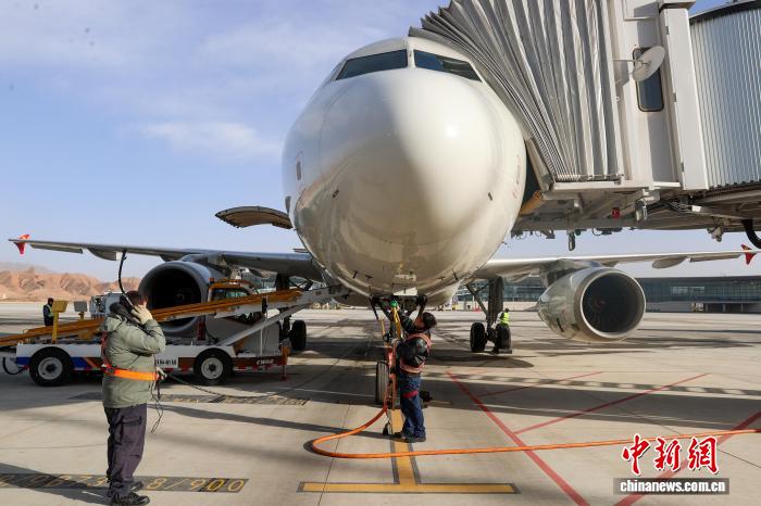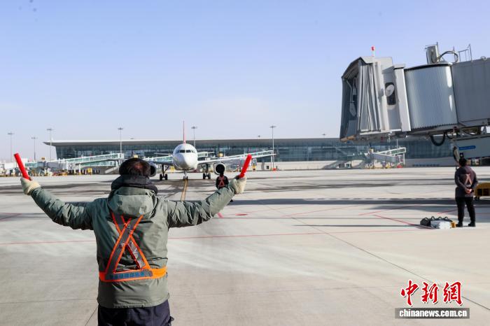 11月26日,青海海东,西宁曹家堡邦际机场机务培修员启铺冬航季建筑换季维保,齐力保证航班遨游飞翔平安,保证下本机场下效运转。图为平易近航机务培修职员正在天里指引飞机平安进位。中新社记者 薛蒂 摄
