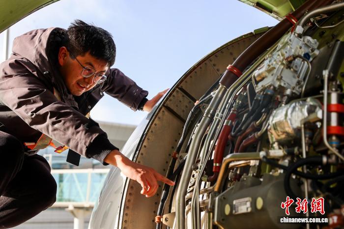 11月26日,青海海东,西宁曹家堡邦际机场机务培修员启铺冬航季兴办换季维保,齐力保证航班遨游飞翔平安,保证下本机场下效运转。图为平易近航机务修理职员查抄飞机策动机。中新社记者 薛蒂 摄